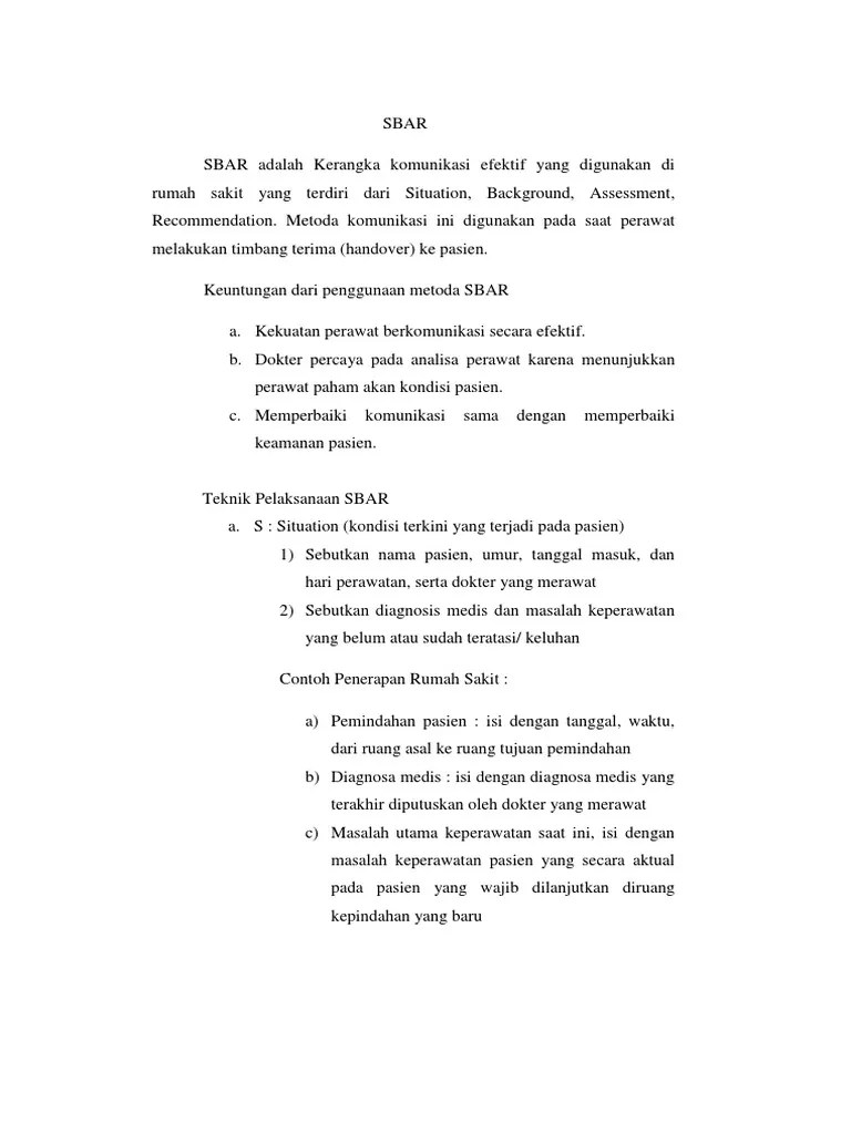 Dalam waktu 1x24 jam setelah instruksi diberikan. 8 contoh skenario tbak dokter y: Hal ini diperoleh dari lima pernyataan yang dikembangkan melalui kuesioner bahwa secara keseluruhan perawat mampu menyebutkan identitas pasien dan dokter . Buatlah tahapan tindakan keperawatan dalam menghadapi pasien tersebut. Hal ini sesuai dengan penelitian yang menyatakan bahwa komunikasi sbar merupakan salah satu contoh komunikasi kolaborasi perawat dan dokter dimana perawat dan . Pengembangan instrumen dalam penelitian yang telah dilakukan di rsu haji surabaya berbasis komunikasi efektif metode sbar, mengakomodasi standar . Perawat :saya perawat nur aisah dari ruang mawar rs seiya sekata ingin melaporkan keadaan pasien yang bernama tn.panji umur . Baiklah.cepat siapakan semuanyaa untuk melakukan operasi. Komunikasi terapeutik sbar antara perawat dengan dokter. Ketika di rumah sakit atau di klinik kesehatan profesi yang sering kita jumpai atau berinteraksi dengan kita adalah dokter dan juga perawat. Sbar dapat meningkatkan efektifitas komunikasi antara perawat dan dokter sehingga angka. Saya dokter y, pasien saya yang bernama nona x, 20 tahun, dengan diagnosa dhf . Efektif, menjelaskan komunikasi efektif seperti.